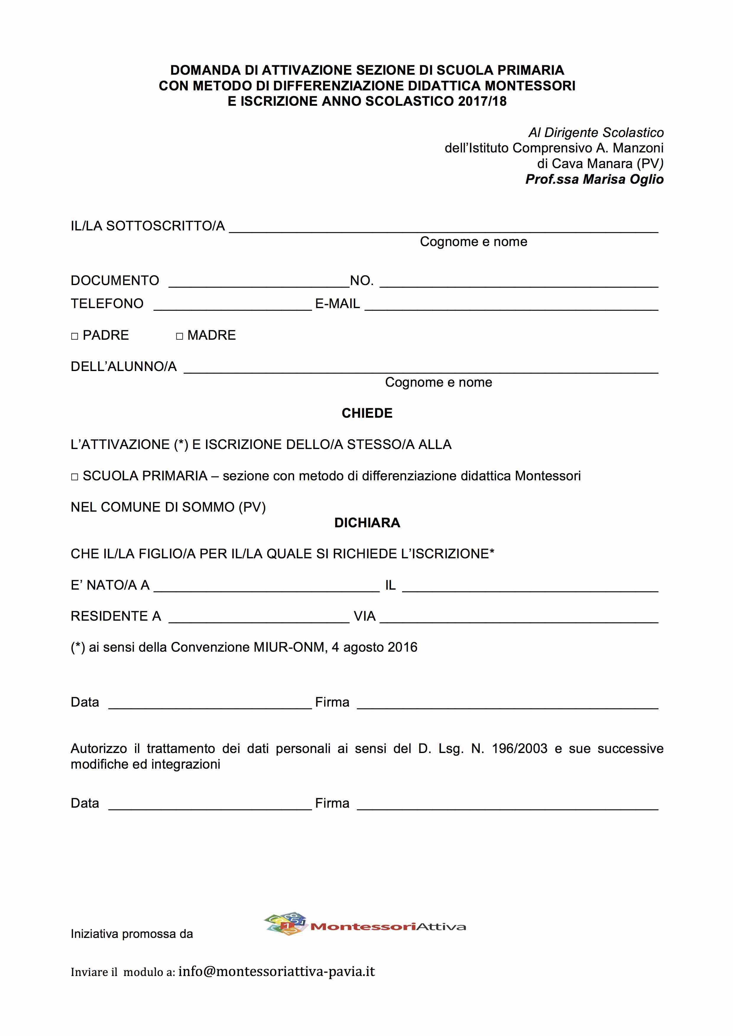 Per formalizzare la disponibilità d’iscrizione del/la figlio/a alla classe Montessori presso questa scuola, chiediamo a tutte le famiglie interessate d’inviare entro il 18 dicembre il modulo in calce all’indirizzo e-mail: info@montessoriattiva-pavia.it